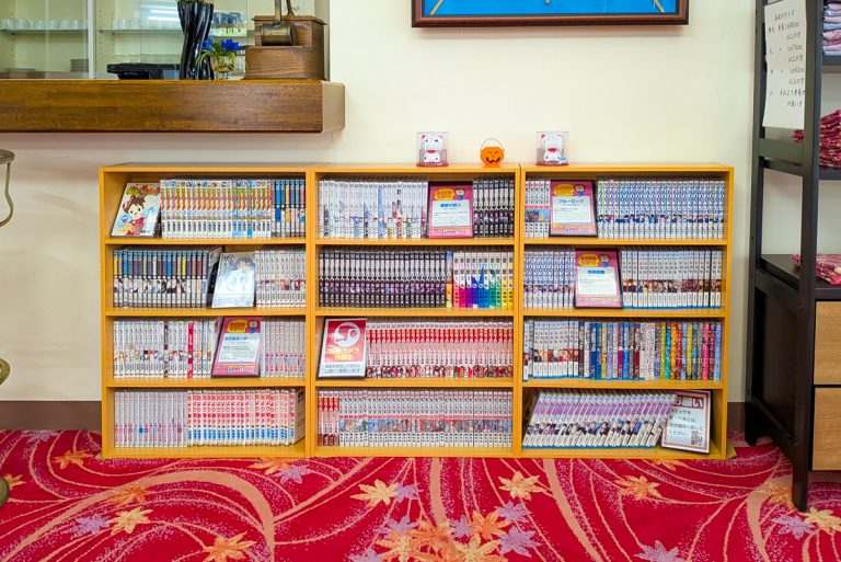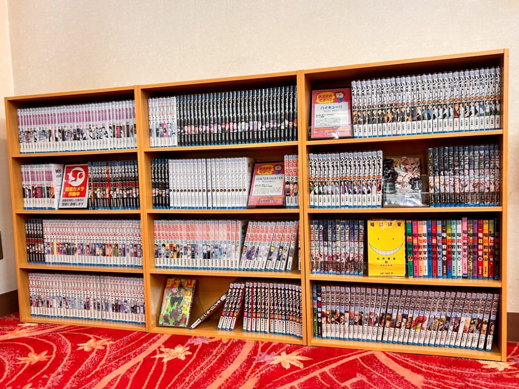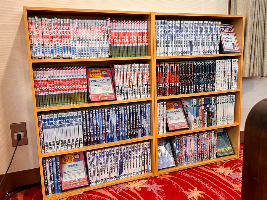 旅館での滞在時間をより楽しく、充実したものにしていただくために、約1,000冊の漫画コーナーを開設いたしました。お部屋やラウンジで、ご自由にお楽しみいただけます。