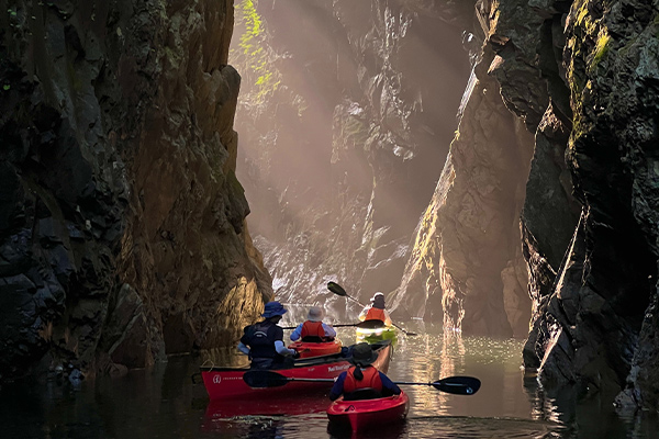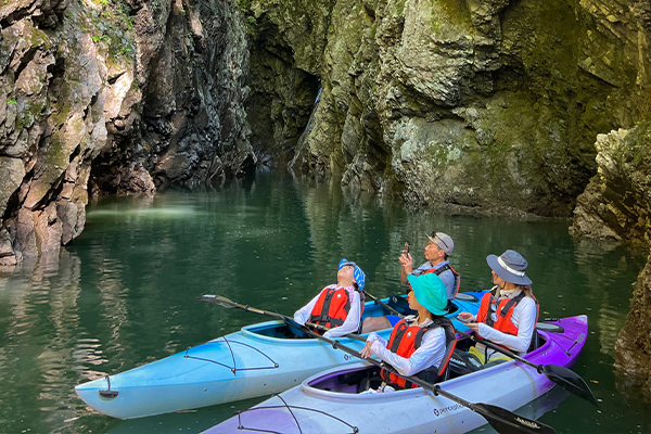 断崖絶壁に囲まれた秘境を目指す往復2時間以上のロングカヌーツアーです。