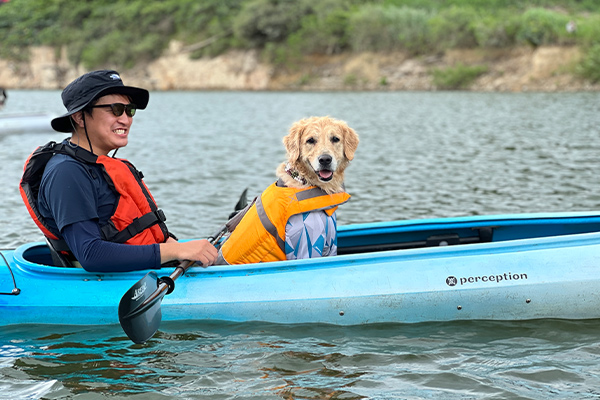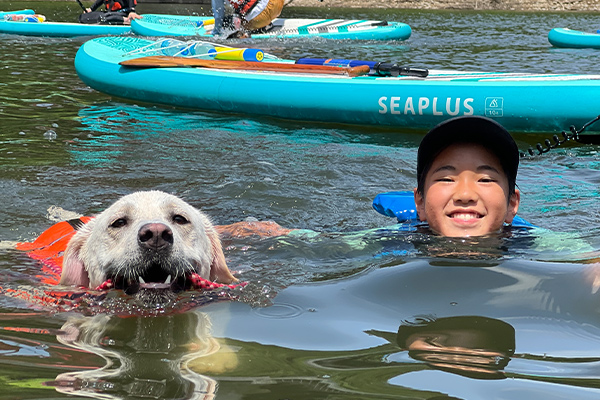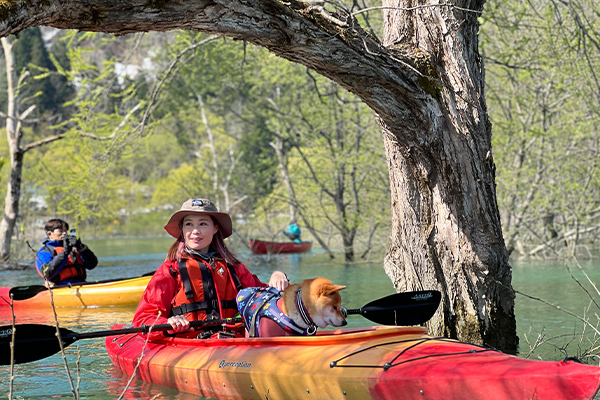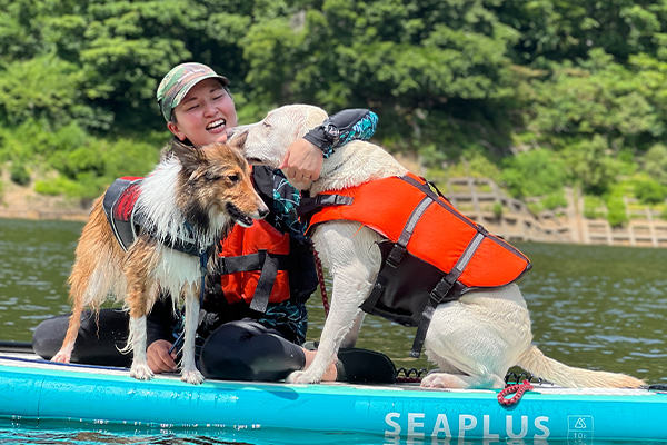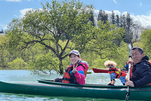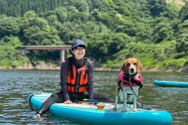 自然溢れる山形の湖上でワンちゃんと一緒に水遊び